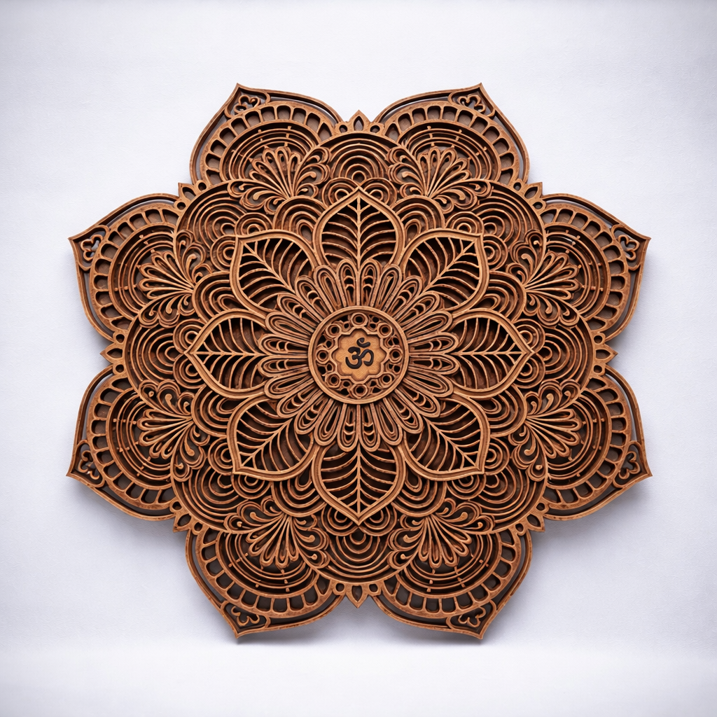 O Símbolo Om (ॐ) no Centro da Mandala No coração desta peça, encontra-se o símbolo sagrado "Om" (ou Aum), reconhecido como o som primordial do universo e a essência da respiração vital. Posicionado estrategicamente no centro da mandala, ele atua como o ponto focal absoluto de energia e meditação. O Om representa a paz profunda, a harmonia e a conexão espiritual. Ao unir a geometria sagrada das múltiplas camadas de MDF com este símbolo central, a mandala deixa de ser apenas um item decorativo para se tornar um verdadeiro instrumento de harmonização, elevando a vibração do ambiente e transformando o espaço em um refúgio de tranquilidade, foco e bem-estar.
